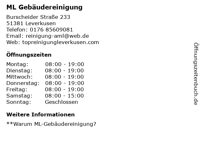 | Öffnungszeiten ML Gebäudereinigung in Leverkusen anzeigen | |