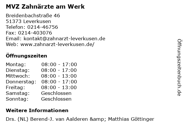 | Öffnungszeiten MVZ Zahnärzte am Werk in Leverkusen anzeigen | |