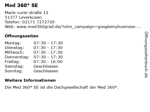 | Öffnungszeiten Med 360° SE in Leverkusen anzeigen | |