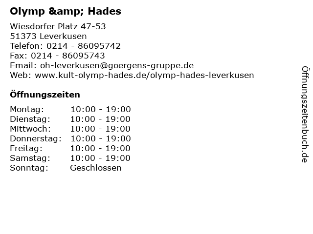 | Öffnungszeiten Olymp & Hades in Leverkusen anzeigen | |
