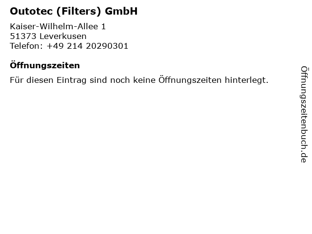 | Öffnungszeiten Outotec (Filters) GmbH in Leverkusen anzeigen | |