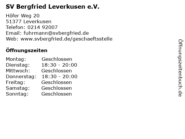 Branchen & Suchbegriffe zu SV Bergfried Leverkusen e.V.:bergfried, e.v., geschäftsstelle, sv, verein |