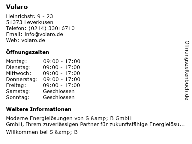 | Öffnungszeiten Volaro in Leverkusen anzeigen | |