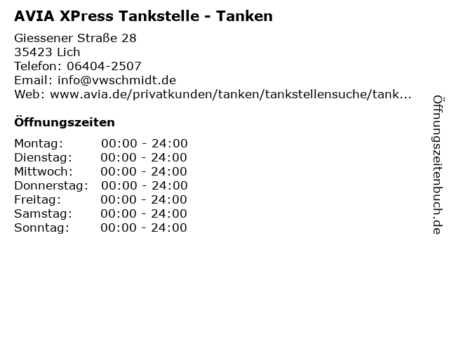 | Öffnungszeiten AVIA XPress Tankstelle - Tanken in Lich anzeigen | |
