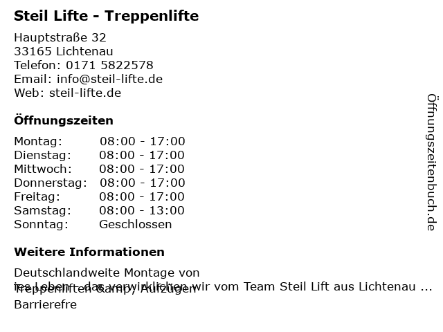 | Öffnungszeiten Steil Lifte - Treppenlifte in Lichtenau anzeigen | |