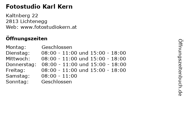 | Öffnungszeiten Fotostudio Karl Kern in Lichtenegg anzeigen | |