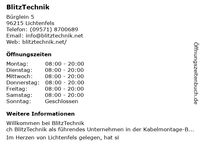 | Öffnungszeiten BlitzTechnik in Lichtenfels anzeigen | |
