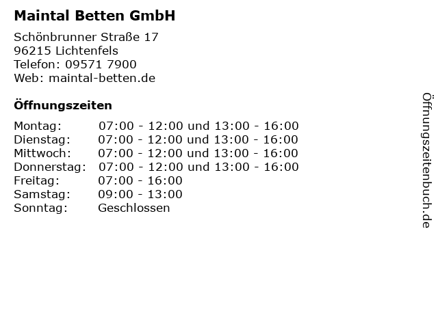 | Öffnungszeiten Maintal Betten GmbH in Lichtenfels anzeigen | |