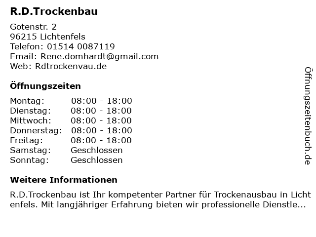 | Öffnungszeiten R.D.Trockenbau in Lichtenfels anzeigen | |