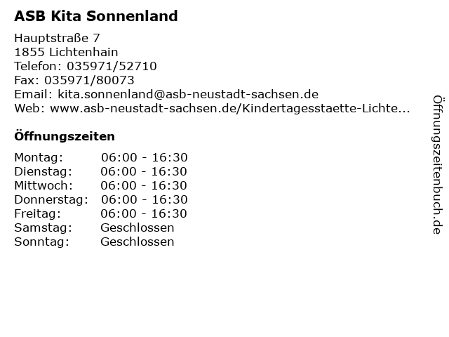 | Öffnungszeiten ASB Kita Sonnenland in Lichtenhain anzeigen | |