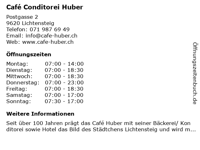 Hinweis: Seit über 100 Jahren prägt das Café Huber mit seiner Bäckerei/ Konditorei sowie Hotel das Bild des Städtchens Lichtensteig und wird mittlerweile in der 4. Generation geführt.