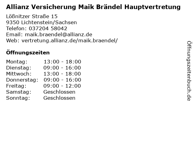 1 Allianz Versicherung Karsten Mehlhorn Hauptvertretung (Entfernung: 0,90 km) Feldstraße 8 b, 09350 Lichtenstein/Sachsen 2 Mecklenburgische Versicherungsgruppe - Hauptvertretung Madeleine-S. Grummt (Entfernung: 1,01 km) Rödlitzer Straße 27, 09350 Lichtenstein 4 Allianz Versicherung Dandy Selbmann Hauptvertretung (Entfernung: 4,99 km) Hofgraben 23, 09355 Gersdorf 6 |