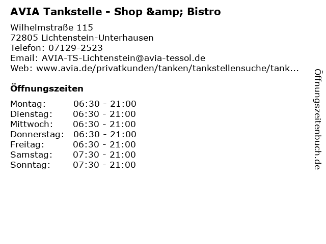 2 AVIA Tankstelle - Waschanlage (Entfernung: 0,00 km) Wilhelmstraße 115, 72805 Lichtenstein-Unterhausen 6 |
