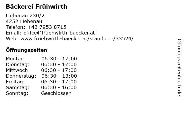 | Öffnungszeiten Bäckerei Frühwirth in Liebenau anzeigen | |