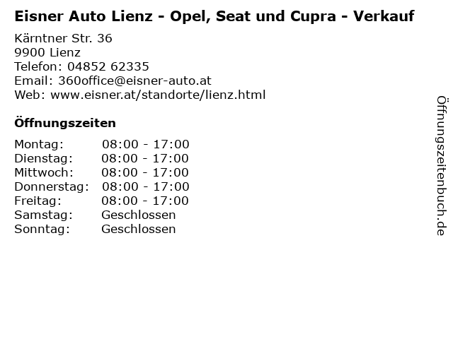 1 Eisner Auto GmbH - Opel, Seat, Cupra - Teile & Zubehör (Entfernung: 0,01 km) Kärntnerstraße 36, 9900 Lienz 6 Autohaus Harald Kaufmann GmbH & CoKG (Verkauf) (Entfernung: 51,75 km) Brucker Bundesstraße 114, 5700 Zell Am See |