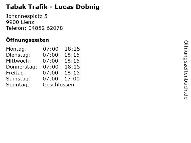 | Öffnungszeiten Tabak Trafik - Lucas Dobnig in Lienz anzeigen | |