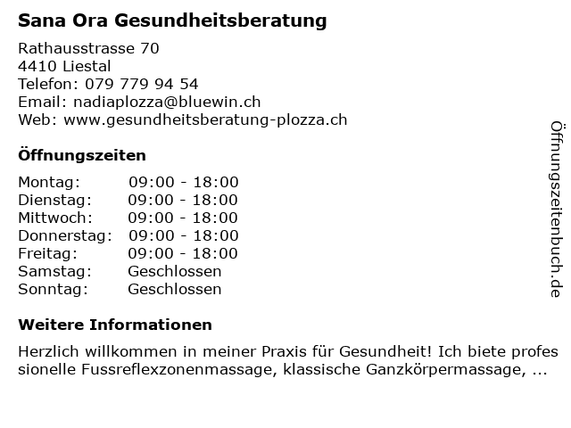 | Öffnungszeiten Sana Ora Gesundheitsberatung in Liestal anzeigen | |
