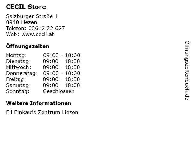 | Öffnungszeiten CECIL Store in Liezen anzeigen | |