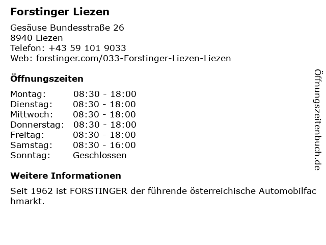 | Öffnungszeiten Forstinger Liezen in Liezen anzeigen | |