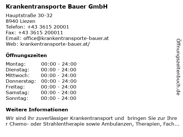 | Telefonnummer Krankentransporte Bauer GmbH in Liezen (+43 3615 20001) anrufen | |