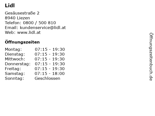 | Öffnungszeiten Lidl in Liezen anzeigen | |