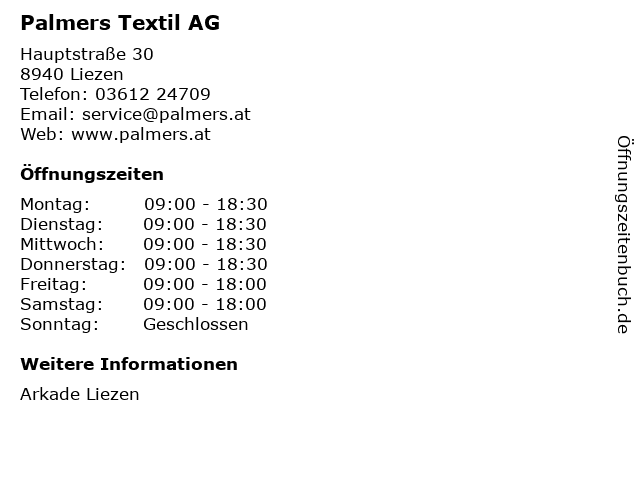 | Öffnungszeiten Palmers Textil AG in Liezen anzeigen | |
