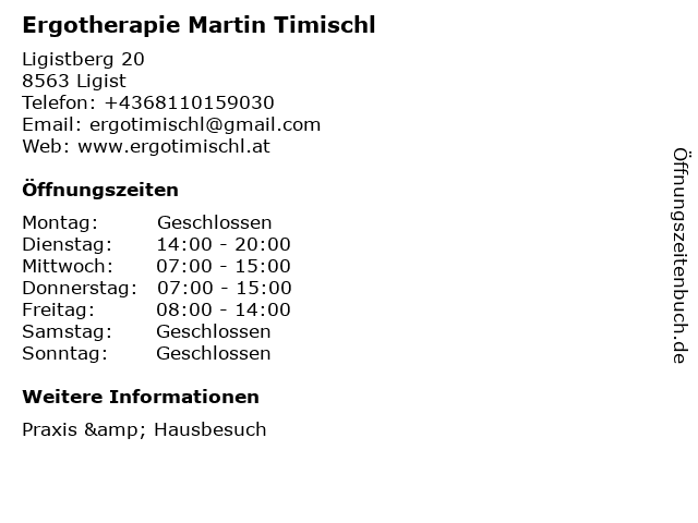 | Öffnungszeiten Ergotherapie Martin Timischl in Ligist anzeigen | |