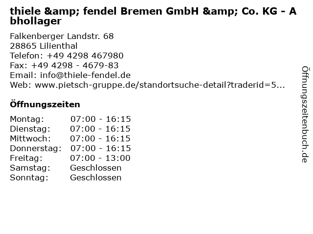 2 thiele & fendel Bremen GmbH & Co. KG - Abhollager (Entfernung: 10,39 km) Dölvesstraße 8, 28207 Bremen 3 thiele & fendel Bremen GmbH & Co. KG - Abhollager (Entfernung: 14,70 km) Duckwitzstraße 86, 28199 Bremen 4 thiele & fendel Bremen GmbH & Co. KG - Abhollager (Entfernung: 16,23 km) Heidkamp 27 -29, 27721 Ritterhude 6 |