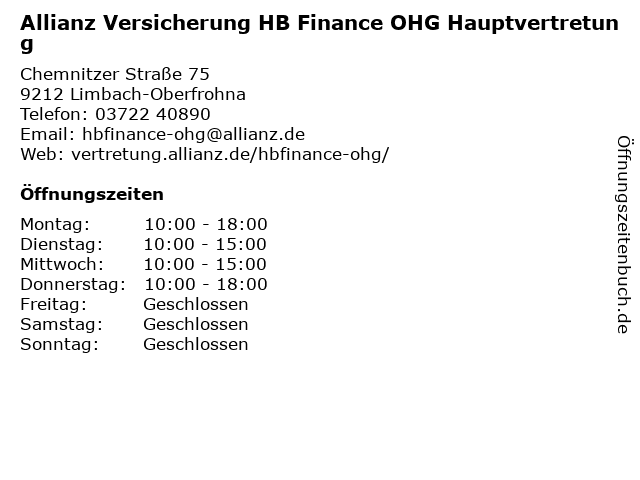 1 Allianz Versicherung HB Finance OHG Hauptvertretung (Entfernung: 4,79 km) Chemnitzer Straße 78, 09224 Chemnitz 2 Allianz Versicherung HB Finance OHG Hauptvertretung (Entfernung: 12,56 km) Frankenberger Straße 221, 09131 Chemnitz 3 Allianz Versicherung Marko Sonntag Hauptvertretung (Entfernung: 0,82 km) Hauptstraße 28 b, 09212 Limbach-Oberfrohna 4 AXA Versicherung - Hauptvertretung Bernd Fleischer (Entfernung: 5,12 km) Chemnitzer Str. 159, 09224 Grüna 6 Allianz Versicherung Tom Putbrese Hauptvertretung (Entfernung: 9,87 km) Schönherrstraße 8, 09113 Chemnitz |