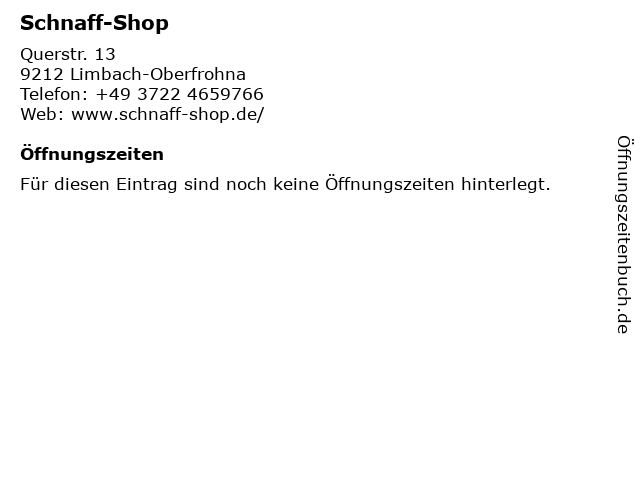 | Öffnungszeiten Schnaff-Shop in Limbach-Oberfrohna anzeigen | |