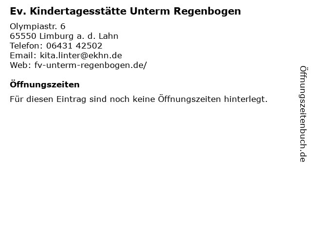 2 Ev. Kindertagesstätte Unterm Regenbogen Linter - Evangelische Kirchengemeinde Mensfelden-Linter (Entfernung: 0,05 km) Olympiastraße 4, 65550 Limburg 6 |