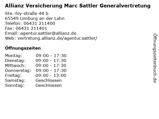 2 Allianz Versicherung T.Martin L.Wilming GbR Generalvertretung (Entfernung: 0,68 km) Am Renngraben 2, 65549 Limburg an der Lahn 3 AXA Versicherung - Generalvertretung Graser & Kosik oHG (Entfernung: 0,74 km) Dr.-Wolff-Str. 4, 65549 Limburg 4 Allianz Limburg Manuel Vollbrecht Generalvertretung (Entfernung: 1,13 km) Offheimer Weg 36, 65549 Limburg 5 AXA Versicherung - Generalvertretung Randolf Kuenstler (Entfernung: 3,03 km) Bahnhofsweg 1 G, 65582 Diez 6 Allianz Versicherung Rainer Diell Generalvertretung (Entfernung: 4,98 km) Wiesenstraße 21, 65558 Flacht |