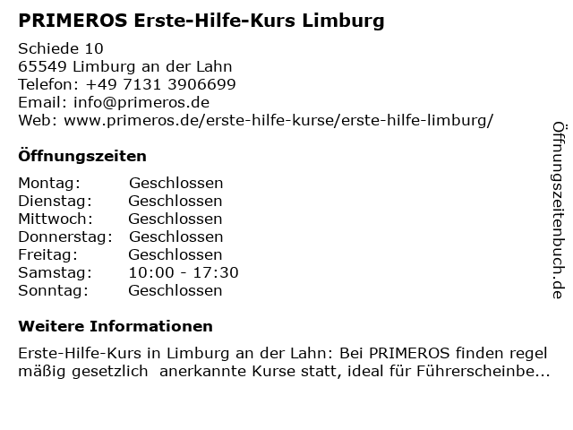 Branchen & Suchbegriffe zu PRIMEROS Erste-Hilfe-Kurs Limburg:erste, erste hilfe am unfallort, erste hilfe kurs, erste-hilfe, erste-hilfe-kurs, führerschein sehtest, herz-lungen-wiederbelebung, herzinfarkt, hilfe, kurs, primeros, schlaganfall, stabile seitenlage, verbandmaterial, weiterbildung |
