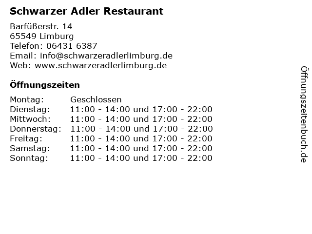 | Öffnungszeiten Schwarzer Adler Restaurant in Limburg anzeigen | |