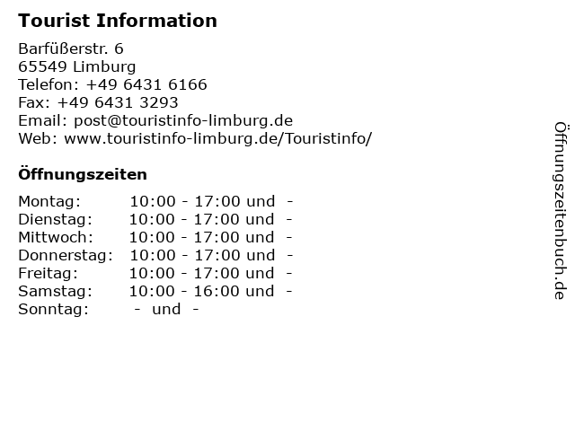 | Öffnungszeiten Tourist Information in Limburg anzeigen | |