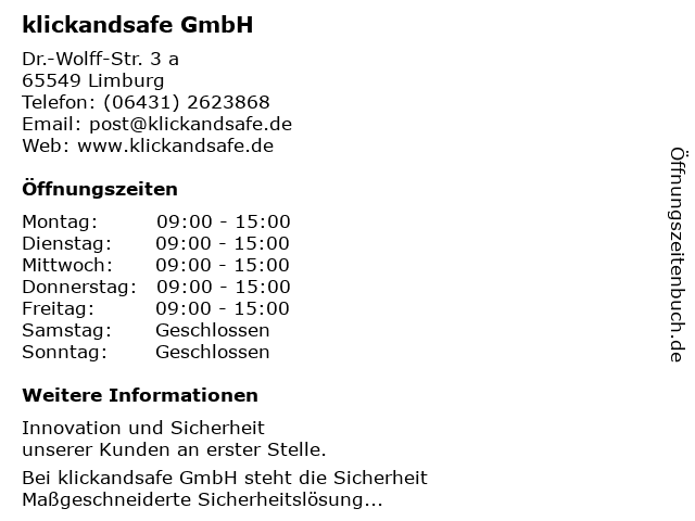 | Öffnungszeiten klickandsafe GmbH in Limburg anzeigen | |