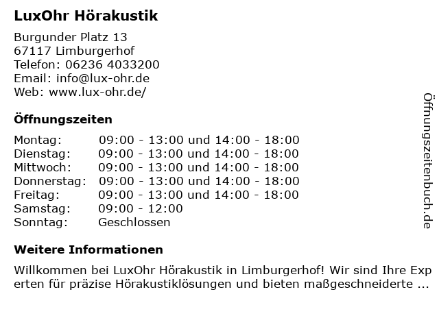 | Öffnungszeiten LuxOhr Hörakustik in Limburgerhof anzeigen | |