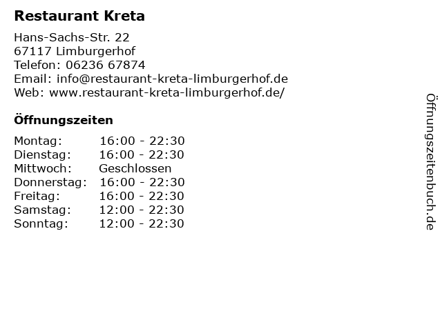 | Öffnungszeiten Restaurant Kreta in Limburgerhof anzeigen | |