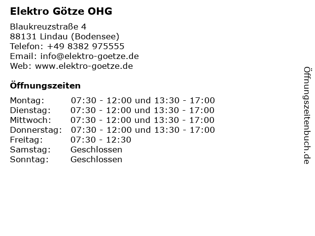 | Öffnungszeiten Elektro Götze OHG in Lindau (Bodensee) anzeigen | |
