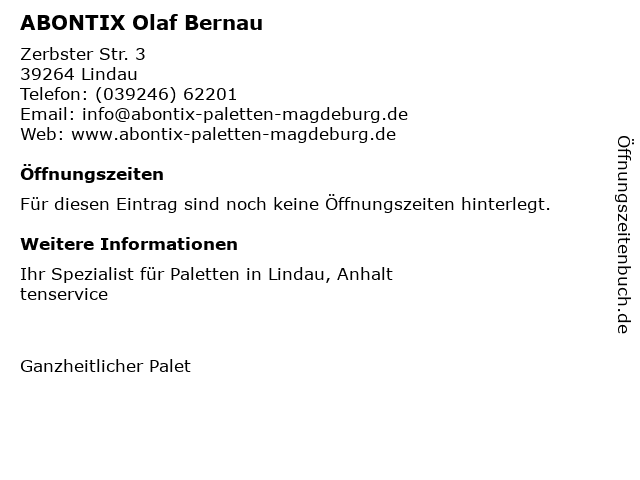 | Öffnungszeiten ABONTIX Olaf Bernau in Lindau anzeigen | |