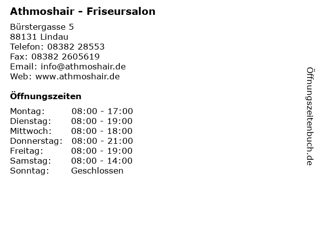 | Öffnungszeiten Athmoshair - Friseursalon in Lindau anzeigen | |