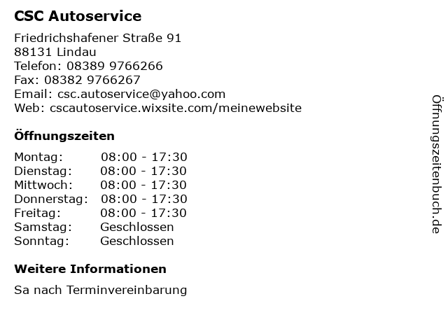 | Öffnungszeiten CSC Autoservice in Lindau anzeigen | |