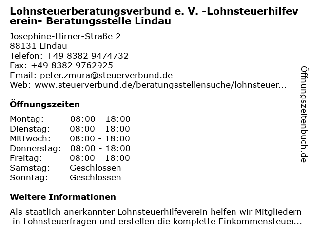 Branchen & Suchbegriffe zu Lohnsteuerberatungsverbund e. V. -Lohnsteuerhilfeverein- Beratungsstelle Lindau:beratungsstelle, e., einkommensteuererklärung, lohnsteuerberatungsverbund, lohnsteuererklärung, lohnsteuerhilfe lindau, lohnsteuerhilfeverein, lohnsteuerhilfeverein lindau, lohnsteuerjahresausgleich, steuerberater, steuererklärung, v. |