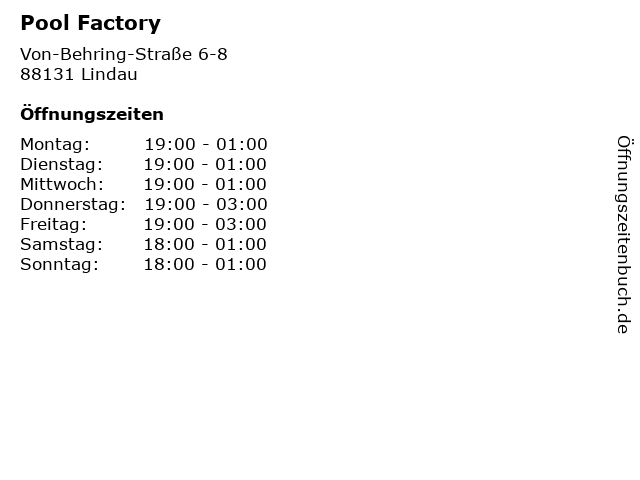 | Öffnungszeiten Pool Factory in Lindau anzeigen | |