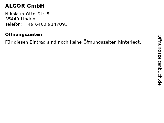 | Öffnungszeiten ALGOR GmbH in Linden anzeigen | |