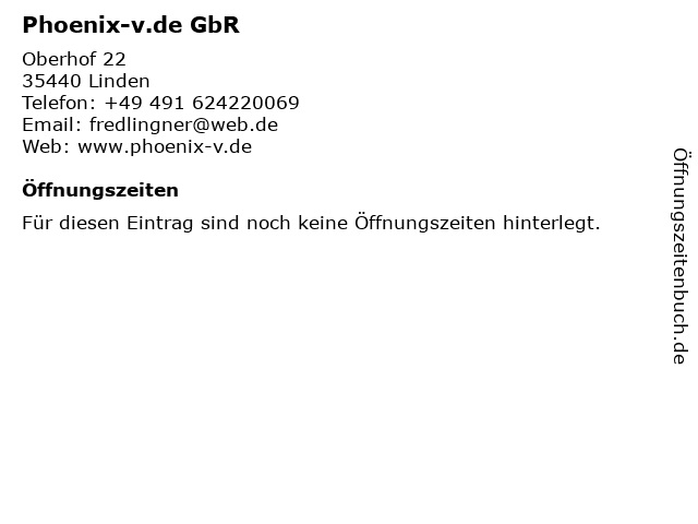 | Öffnungszeiten Phoenix-v.de GbR in Linden anzeigen | |