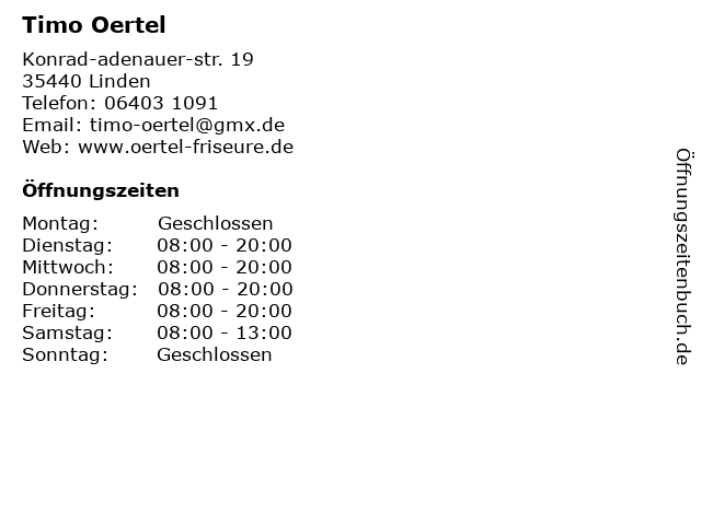 | Öffnungszeiten Timo Oertel in Linden anzeigen | |