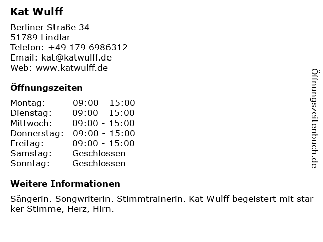 | Öffnungszeiten Kat Wulff in Lindlar anzeigen | |