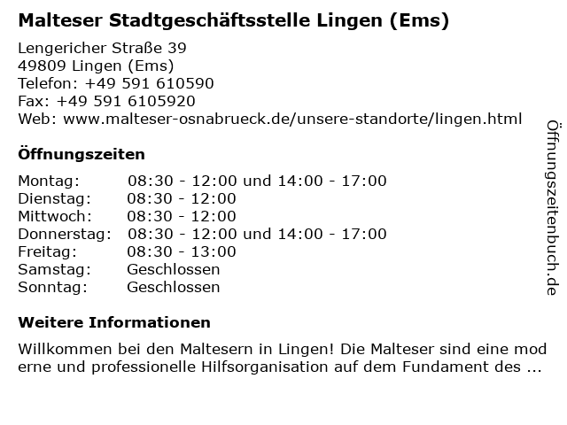 1 Malteser Hilfsdienst gGmbh Dienststelle Meppen (Entfernung: 18,31 km) Hasebrinkstraße 50a, 49716 Meppen 3 Johanniter-Unfall-Hilfe e.V. - Dienststelle Ortsverband Ems-Vechte (Lingen) (Entfernung: 0,68 km) Josefstraße 35, 49809 Lingen 6 |
