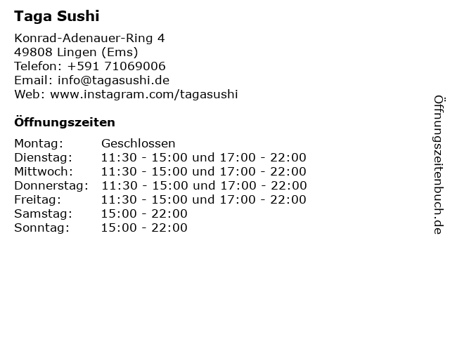 | Öffnungszeiten Taga Sushi in Lingen (Ems) anzeigen | |